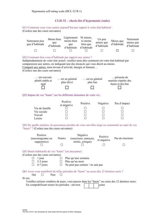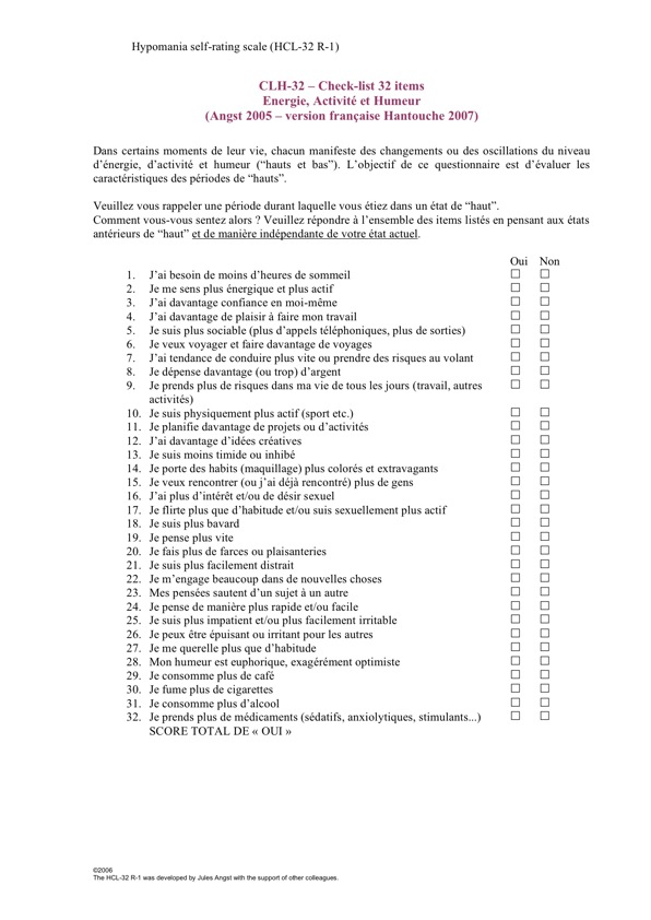 Check-list d’Hypomanie (CLH-32) pour diagnostiquer une hypomanie.
