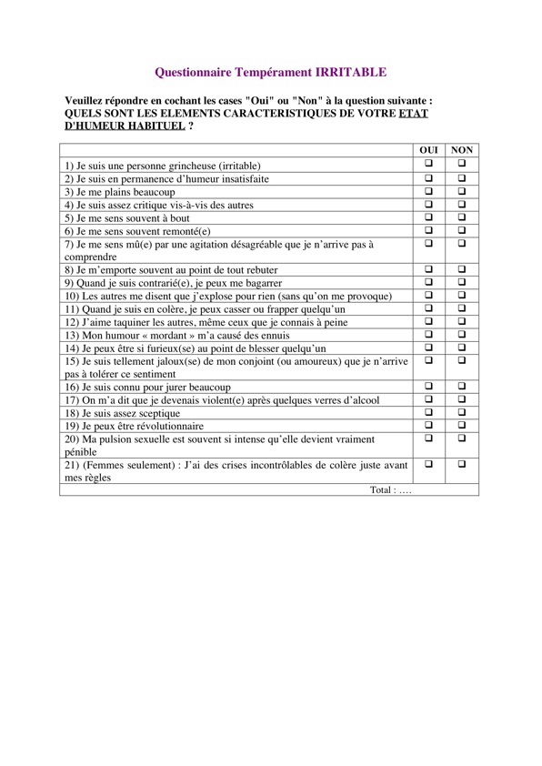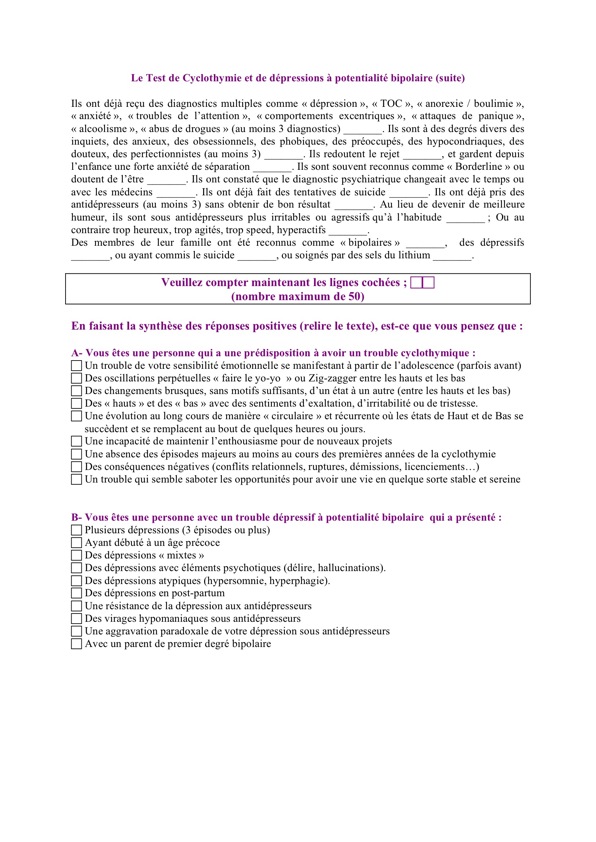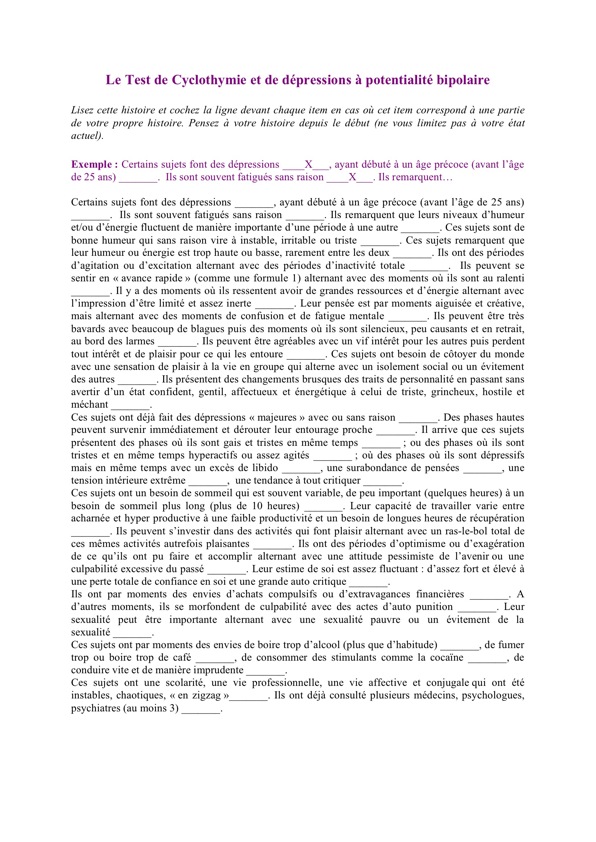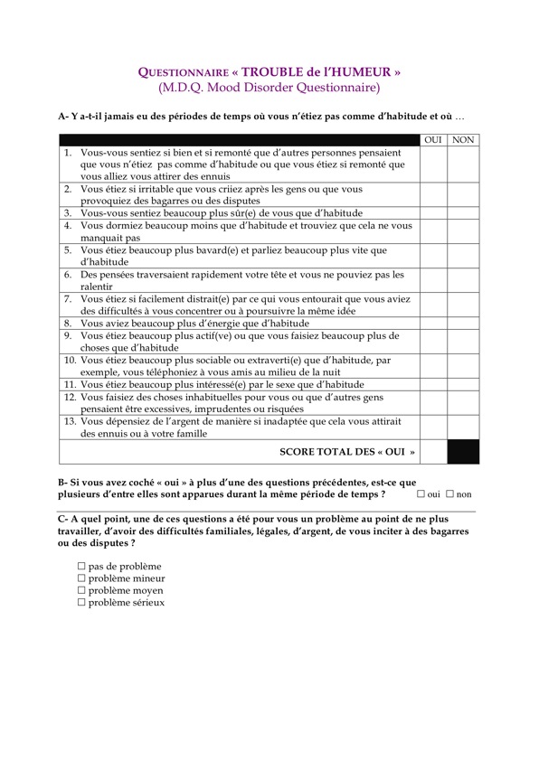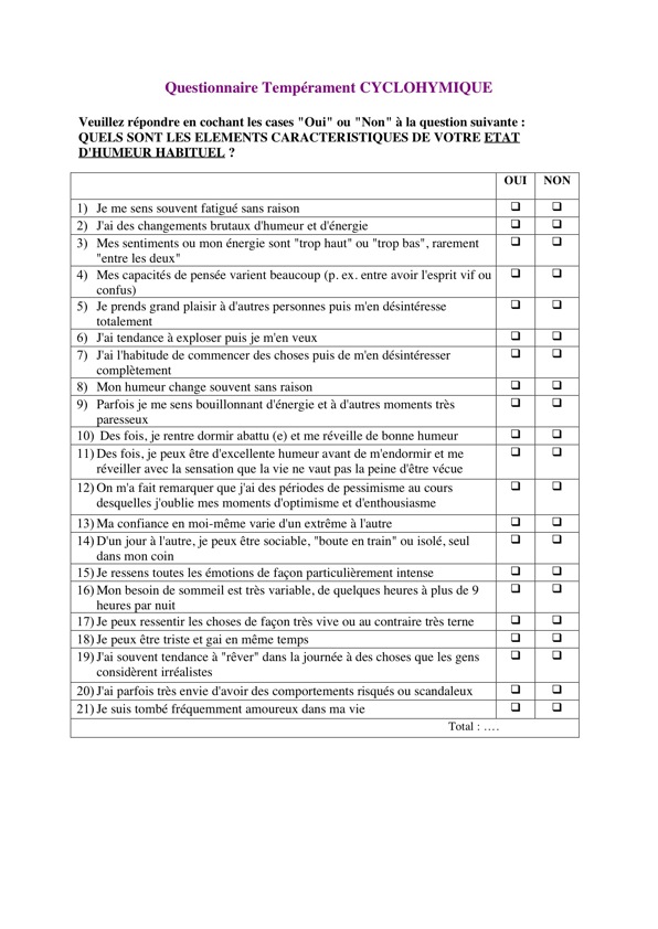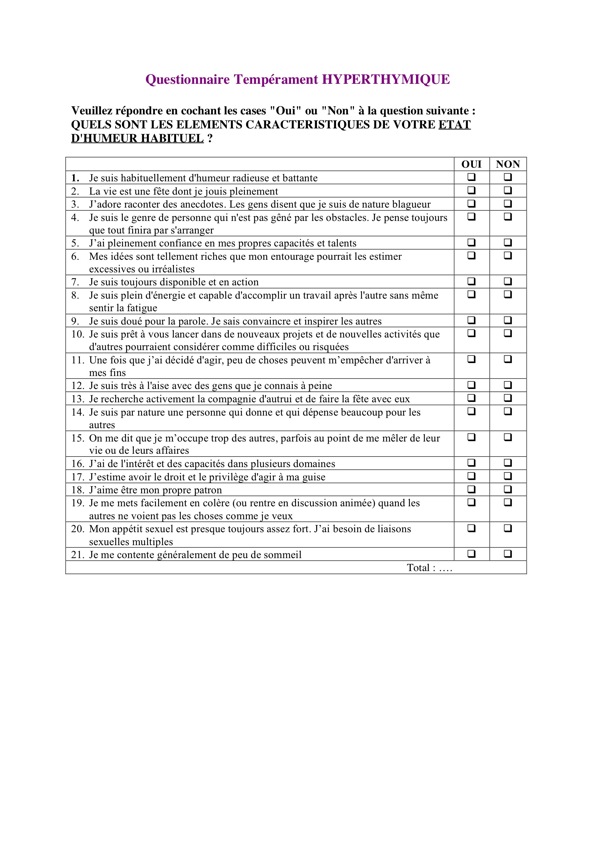 Dans certains moments de leur vie, chacun manifeste des changements ou des oscillations du niveau d'énergie, d'activité et d'humeur ("hauts et bas"). L'objectif de ce questionnaire est dévaluer les caractéristiques des périodes de "hauts".