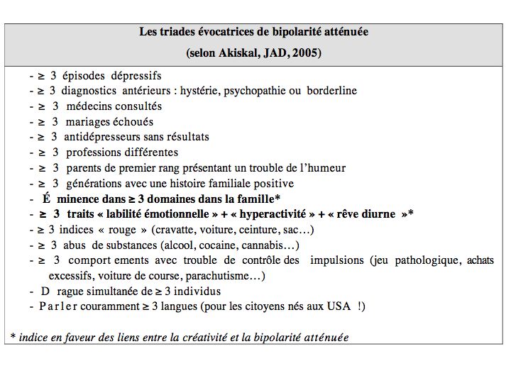 On dispose actuellement de questionnaires aidant au dépistage de l’hypomanie et de la cyclothymie. Ce sont les indices les plus fréquents et pertinents pour repérer une bipolarité atténuée. L’analyse biographique et les excès tempéramentaux sont plus utiles et cohérents pour dépister le BP-II que la recherche des critères classiques de l’hypomanie ou la cyclothymie (selon les critères officiels).