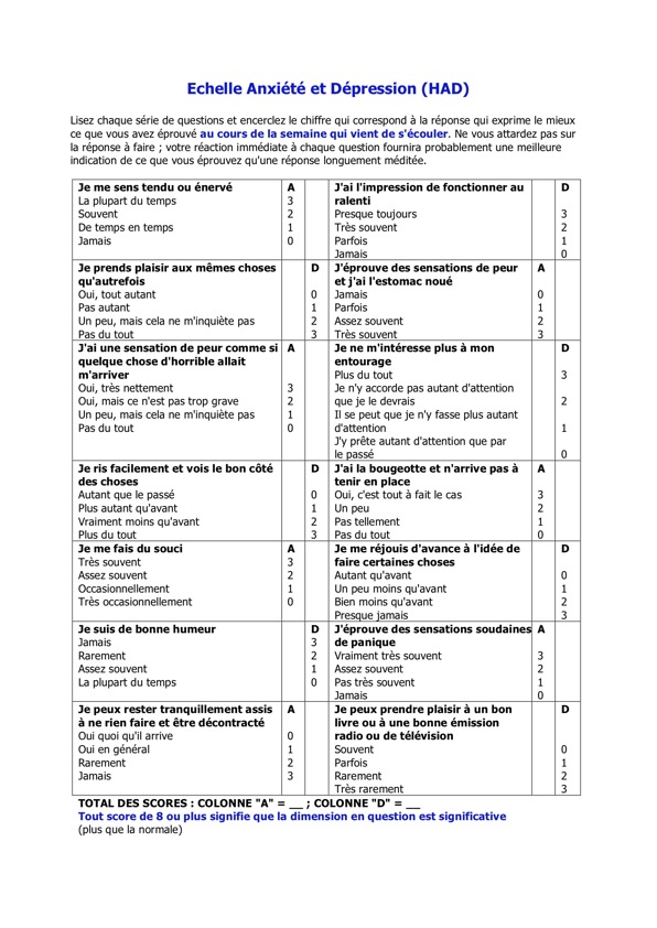 Le test d'évaluation de l'anxiété et de la dépression